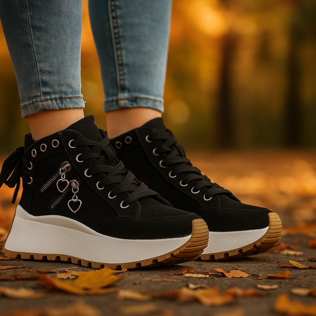 Dotées d'une semelle intérieure orthopédique amortissante et d'une semelle amortissante, ces baskets montantes offrent un confort durable et une touche streetwear audacieuse. Les coutures texturées renforcent la durabilité et le caractère, tandis que les doubles fermetures éclair latérales et la fermeture à lacets ajoutent fonctionnalité et style urbain. Dotées d'une semelle extérieure striée pour une adhérence optimale, elles sont idéales pour bouger toute la journée avec un style unique.