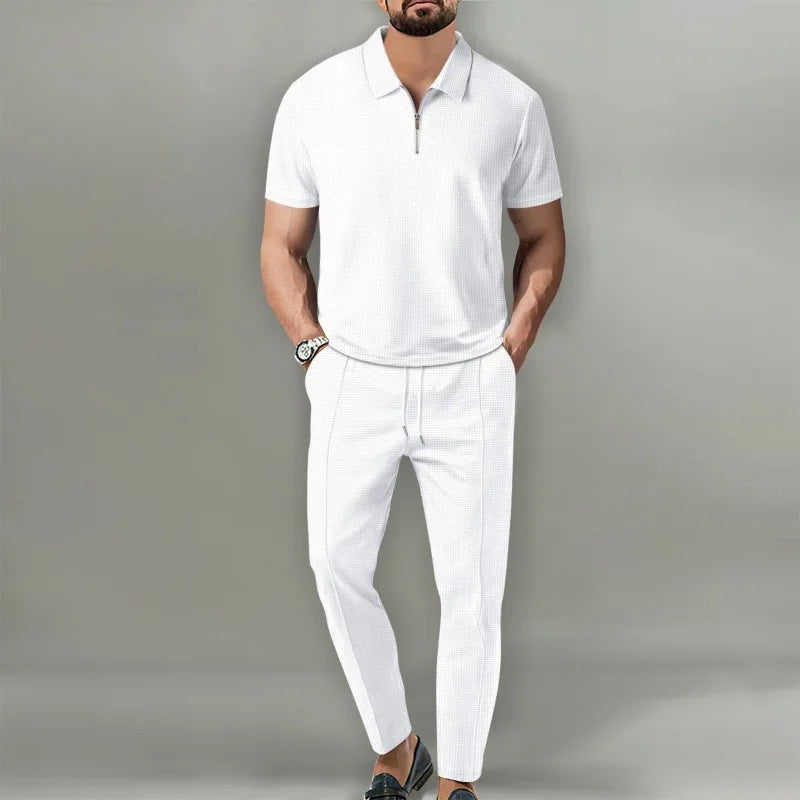 Confectionné en maille douce et respirante, cet ensemble polyvalent est doté d'une élégante fermeture éclair au col et est parfait pour les journées décontractées à la plage ou les sorties décontractées.