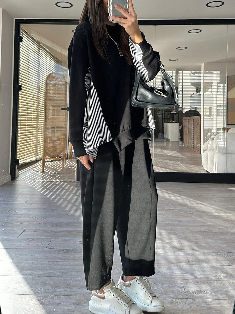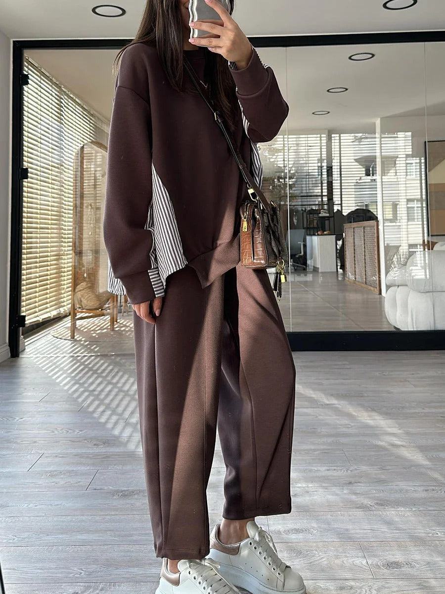 Adoptez l’Ensemble Deux Pièces Décontracté à Rayures et Patchwork pour Femme — une tenue moderne qui allie confort, créativité et style unique.