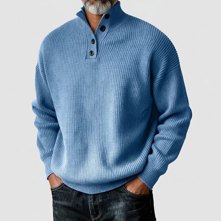 Chic et confortable, ce pull décontracté bleu ciel combine une maille côtelée douce à un col montant à demi-boutons. Idéal pour un look casual soigné, il allie chaleur, style et praticité au quotidien.