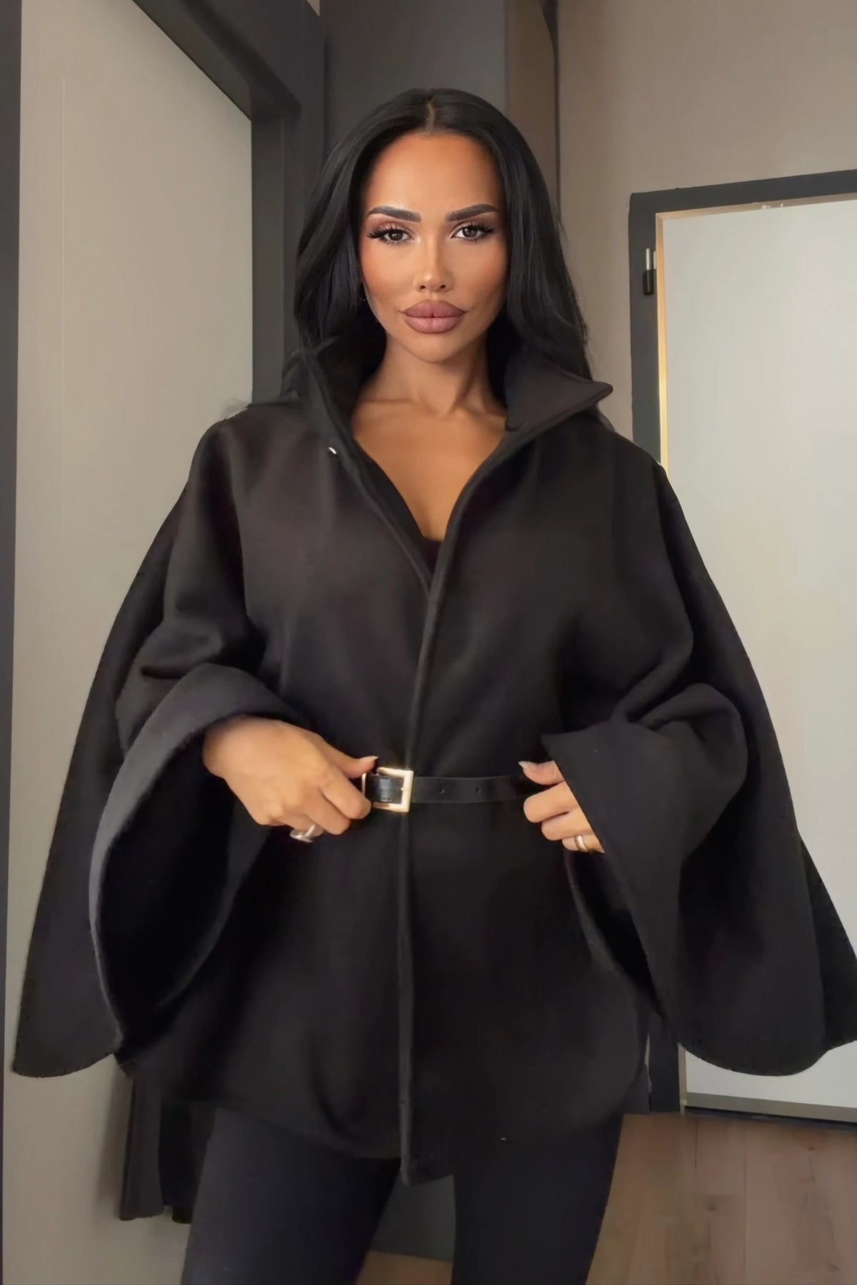Poncho en laine de mérinos orné d'une ceinture