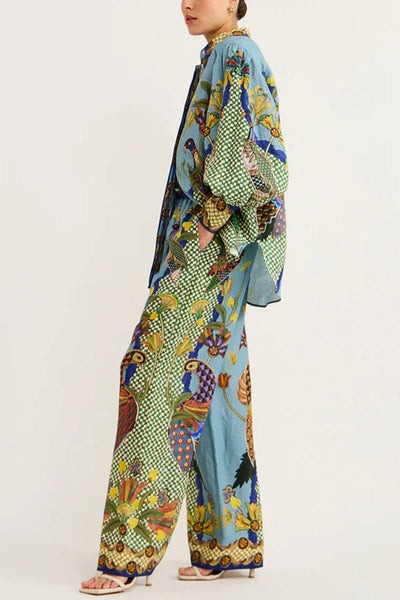 Cet ensemble en satin lumineux se distingue par son imprimé unique aux accents ensoleillés, parfait pour apporter fraîcheur et élégance à votre dressing. Composé d’un haut fluide à col chemise et d’un pantalon large à taille élastique, il offre une coupe confortable tout en sublimant la silhouette avec une touche de modernité raffinée.