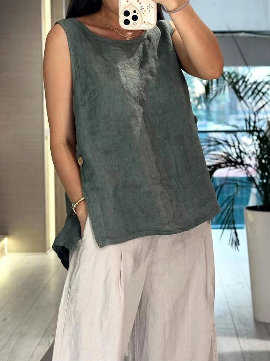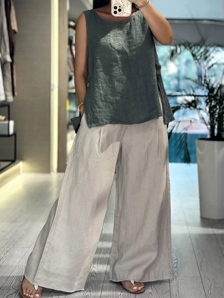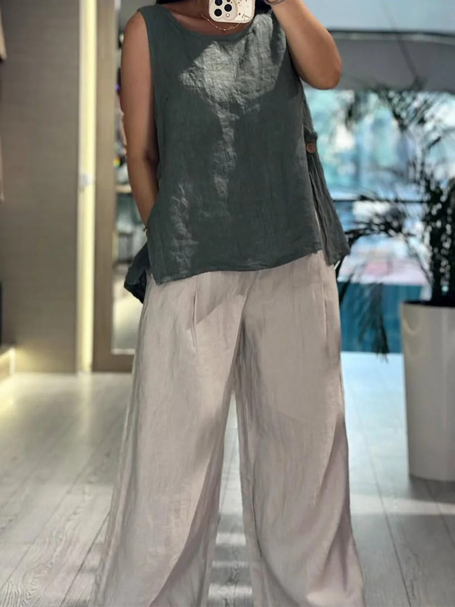Ensemble deux pièces décontracté sans manches en coton et lin