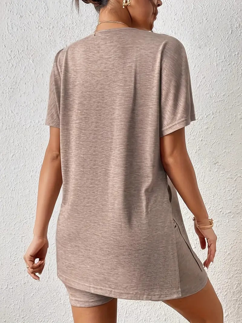 Adoptez un style chic et décontracté avec cet ensemble moderne, parfait pour les journées estivales. Le t-shirt à manches chauve-souris apporte une touche fluide et féminine, tandis que le short uni assure confort et élégance.