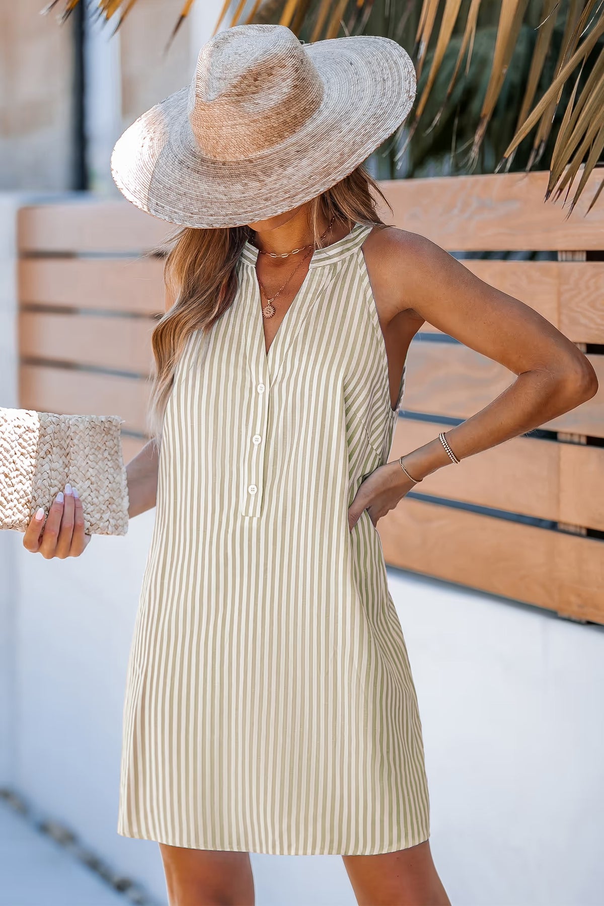 La mini-robe à rayures et col cranté allie confort et sophistication dans une pièce facile à porter ! Son décolleté en V, sa coupe sans manches et son boutonnage sur le devant en font une option élégante et polyvalente pour toutes les occasions.